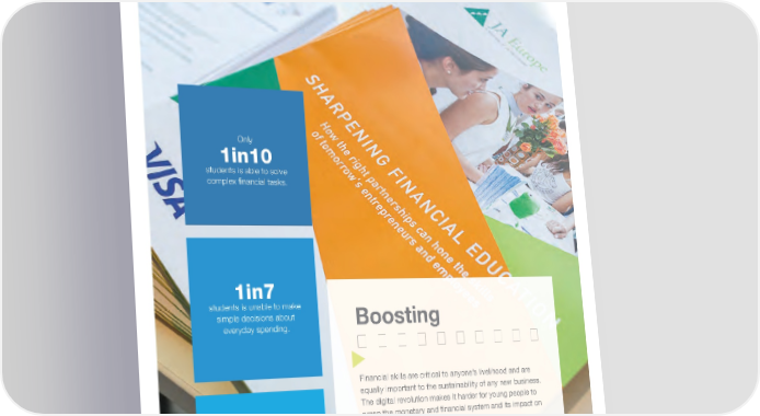 Only 1in10 students is able to solve complex 昀椀nancial tasks. 1in7 students is unable to make simple decisions about everyday spending. Boosting ���������� financial skills are critical to anyone’s livelihood and are equally important to the sustainability of any new business. the digital revolution makes it harder for young people to grasp the monetary and 昀椀nancial system and its impact on our daily decisions. Only 52% Our Priority of adults in Europe are 昀椀nancially literate. Ensure all young people understand basic 昀椀nancial concepts. 34 JA EUROPE / Annual Report 2016