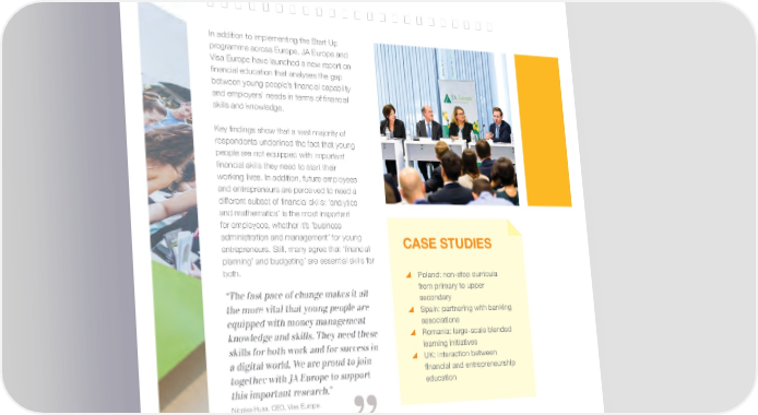 Good practices ����������������������� In addition to implementing the Start Up programme across Europe, JA Europe and Visa Europe have launched a new report on 昀椀nancial education that analyses the gap between young people’s 昀椀nancial capability and employers’ needs in terms of 昀椀nancial skills and knowledge. Key 昀椀ndings show that a vast majority of respondents underlined the fact that young people are not equipped with important 昀椀nancial skills they need to start their working lives. In addition, future employees and entrepreneurs are perceived to need a different subset of 昀椀nancial skills: ‘analytics and mathematics’ is the most important for employees, whether it’s ‘business administration and management’ for young entrepreneurs. Still, many agree that ‘昀椀nancial CASE STUDIES planning’ and budgeting’ are essential skills for both. \ poland: non-stop curricula “The fast pace of change makes it all from primary to upper the more vital that young people are secondary \ spain: partnering with banking equipped with money management associations knowledge and skills. They need these \ romania: large-scale blended skills for both work and for success in learning initiatives a digital world. We are proud to join \ uk: interaction between together with JA Europe to support 昀椀nancial and entrepreneurship this important research,” education Nicolas Huss, CEO, Visa Europe. Developing the right partnerships will help hone the 昀椀nancial skills of tomorrow’s entrepreneurs and employees. JA EUROPE / Annual Report 2016 35