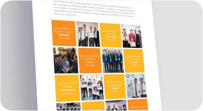 Hall of fame European champions Culminating points of our major programmes include European competitions where winners from each participating country present their business concepts to an external jury. These events are built on the concept of rotating from one country to another and are understood as a meeting place for all stakeholders involved (teachers, business volunteers, students and JA staff). In 2016, the following student teams have won: European Company of European Enterprise the Year Competition: Challenge: Subreader Save Energy (Denmark) (Romania) Social Innovation Relay Social Enterprise 360 Global Finale: European Finale: Oculus Growink (Romania) (Spain) European Sci-Tech Skills for the Future Challenge: European Awards: Team romania AmECS (Romania) (Spain) Global Enterprise AmCham EU Youth Project: Entrepreneurship Award: SOSElder meetingpackage.com (Spain) (Finland) 16 JA EUROPE / Annual Report 2016