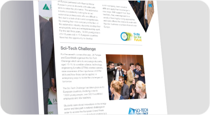 Good practices Skills for the Future JA Europe partnered with Hyundai Motor a mini-company, learn valuable Europe to provide students with adequate skills and apply their knowledge in skills to enter the job market. The automotive new ways. With support from their industry is constantly looking for skilled teachers, they were exposed to a automotive professionals who are dif昀椀cult to variety of learning-by-doing approaches 昀椀nd due to a lack of skills and competencies. and were offered the chance to work with By creating their mini company in the 昀椀eld of Hyundai business volunteers from all over the automotive industry, students develop their Europe. employability skills and entrepreneurship spirit. For the last three years, 10,000 young people (15-18 years old) in 15 European countries have had the opportunity to develop Sci-Tech Challenge For the seventh consecutive year, JA Europe and ExxonMobil organised the Sci-Tech Challenge which aims to encourage students, aged 15-18, to consider science, technology, engineering & maths (STEM) oriented careers, raise awareness of the importance of STEM skills and how these can be applied in enterprising ways to tackle the challenges of tomorrow. The Sci-Tech Challenge has taken place in 10 European countries, involving close to 13000 young people, over 300 ExxonMobil employees and 50+ teachers. Students learn about innovations in the energy sector and take part in national challenges in order to access the European Grand Finale where they can expose their best solution to a high-level jury at the European Parliament. JA partners with more than 5000 businesses in Europe and involves over 165,000 business volunteers; bringing outside expertise into the classroom and preparing young people for tomorrow’s jobs. JA EUROPE / Annual Report 2016 27