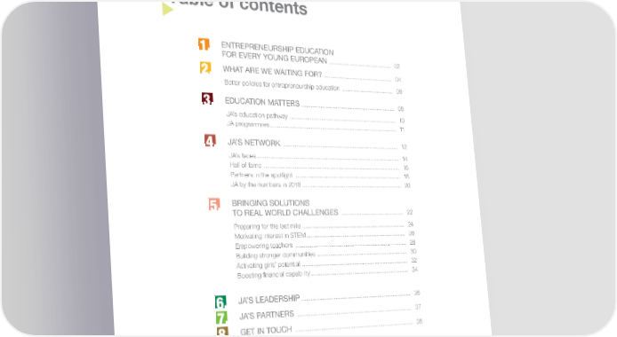 Table of contents EntrEprEnEurship Education 1. ......................................... 02 for EvEry young EuropEan What arE WE Waiting for? ............................................. 04 2. Better policies for entrepreneurship education .................................. 06 Education mattErs ............................................................. 08 3. JA’s education pathway ..................................................................... 10 JA programmes ................................................................................. 11 Ja’s nEtWork .......................................................................... 12 4. JA’s faces .......................................................................................... 14 Hall of fame ....................................................................................... 16 Partners in the spotlight .................................................................... 18 JA by the numbers in 2016 ................................................................ 20 Bringing solutions 5. to rEal World challEngEs ......................................... 22 Preparing for the last mile .................................................................. 24 Motivating interest in STEM ................................................................ 26 Empowering teachers ....................................................................... 28 Building stronger communities .......................................................... 30 Activating girls’ potential .................................................................... 32 Boosting 昀椀nancial capability ............................................................... 34 Ja’s lEadErship ...................................................................... 36 6. Ja’s partnErs ......................................................................... 37 7. gEt in touch ........................................................................... 38 8. JA EUROPE / Annual Report 2016 1