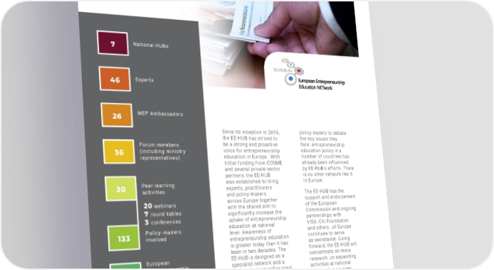 10 Since its inception in 2015, the EE-HUB has strived to be a strong and proactive voice for entrepreneurship education in Europe. With initial funding from COSME and several private sector partners, the EE-HUB was established to bring experts, practitioners and policy-makers across Europe together with the shared aim to significantly increase the uptake of entrepreneurship education at national level. Awareness of entrepreneurship education is greater today than it has been in two decades. The EE-HUB is designed as a specialist network and a think tank. It identifies tried and tested approaches, compares national strategies, monitors progress and organizes peer learning across multiple subject areas. The EE-HUB Round Tables are a unique opportunity for 20 webinars 7 round tables 3 conference s Policy-makers involved Forum members (including ministry representatives) 36 30 Peer learning activities 133 1 st European Entrepreneurship Education Summit in Brussels 40 countries Gathered people from 700 46 Experts 26 MEP Ambassadors 7 National HUBs ENTREPRENEURSHIP EDUCATION FOR EVERY YOUNG EUROPEAN THE EE-HUB www.ee-hub.eu policy leaders to debate the key issues they face: entrepreneurship education policy in a number of countries has already been influenced by EE-HUB's efforts. There is no other network like it in Europe. The EE-HUB has the support and endorsement of the European Commission and ongoing partnerships with VISA, Citi Foundation and others. JA Europe continues to serve as secretariat. Going forward, the EE-HUB will concentrate on more research, on expanding activities at national level and on an even more intensive peer- learning agenda. The second biannual EE- HUB Entrepreneurship Education Summit will take place in Lille in 2019.