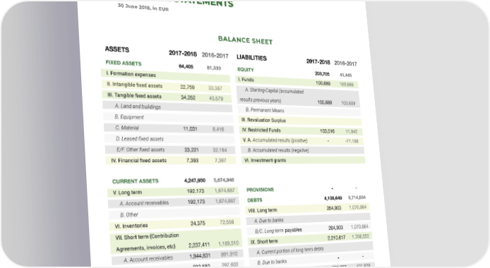 42 JA EUROPE CONSOLIDATED FINANCIAL STATEMENTS 30 June 2018, in EUR ASSETS FIXED ASSETS I. Formation expenses II. Intangible fixed assets III. Tangible fixed assets A. Land and buildings B. Equipment C. Material D. Leased fixed assets E/F. Other fixed assets IV. Financial fixed assets CURRENT ASSETS V. Long term A. Account receivables B. Other VI. Inventories VII. Short term (Contribution Agreements, invoices, etc) A. Account receivables B. Other VIII. Short term financial investments IX. Cash and Bank X. Deferred charges and accrued income Total Assets 5,674,946 1,674,687 1,674,687 72,556 1,189,510 891,910 297,600 3,725 985,434 1,749,034 5,756,279 4,247,950 192,173 192,173 24,375 2,237,411 1,944,831 292,580 3,725 855,141 935,125 4,312,354 2017-2018 2016-2017 64,405 22,759 34,252 11,031 23,221 7,393 81,333 33,367 40,579 8,416 32,164 7,387 LIABILITIES 2017-2018 2016-2017 EQUITY I. Funds A. Starting Capital (accumulated results previous years) B. Permanent Means III. Revaluation Surplus IV. Restricted Funds V. A. Accumulated results (positive) B. Accumulated results (negative) VI. Investment grants 203,705 100,689 100,689 103,016 - 41,445 100,689 100,689 11,942 -71,186 PROVISIONS DEBTS VIII. Long term A. Due to banks B/C. Long term payables IX. Short term A. Current portion of long term debts B. Due to banks C/D. Accounts payable E. Wages, taxes and Social Security F. Other X. Accrued charges and deferred income Total Liabilities - 4,108,649 264,903 264,903 2,210,617 - 697,367 135,064 1,378,186 1,633,129 4,312,354 - 5,714,834 1,070,864 1,070,864 1,706,552 - 421,929 62,244 1,222,378 2,937,419 5,756,279 BALANCE SHEET MORE ABOUT JA EUROPE FINANCIAL STATEMENTS