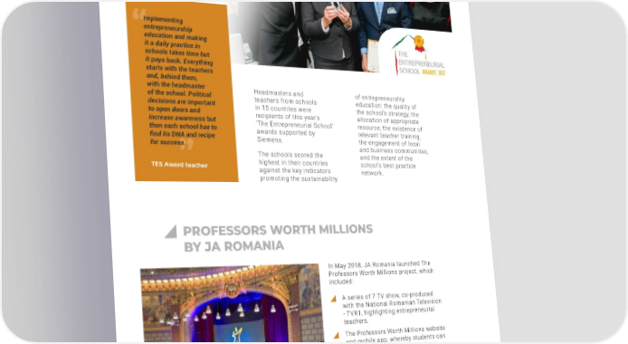 31 Headmasters and teachers from schools in 15 countries were recipients of this years The Entrepreneurial School awards supported by Siemens. The schools scored the highest in their countries against the key indicators promoting the sustainability of entrepreneurship education: the quality of the schools strategy, the allocation of appropriate resource, the existence of relevant teacher training, the engagement of local and business communities, and the extent of the schools best practice network. THE ENTREPRENEURIAL SCHOOL AWARDS PROFESSORS WORTH MILLIONS BY JA ROMANIA In May 2018, JA Romania launched The Professors Worth Millions project, which included: TES Award teacher PREPARING FOR THE FUTURE OF JOBS EMPOWERING TEACHERS Implementing entrepreneurship education and making it a daily practice in schools takes time but it pays back. Everything starts with the teachers and, behind them, with the headmaster of the school. Political decisions are important to open doors and increase awareness but then each school has to find its DNA and recipe for success. A series of 7 TV show, co-produced with the National Romanian Television - TVR1, highlighting entrepreneurial teachers. The Professors Worth Millions website and mobile app, whereby students can nominate the professors who have influenced their way of looking at the world and the future. The "Invest in Education!" Anniversary Gala rewarding outstanding professors for their achievements as well as companies such as MetLife for their investment in education.