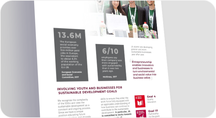 38 We recognize the complexity of the SDGs and view the sustainable development as a constant and ongoing process. Since we have a unique position educating future business leaders, and strongly believe that we can activate young people to work towards achieving the SDGs, we are committed to staying informed and aligning our work with the development. We are committed to educating young people on 21 st century skills to ensure they enter the work force fully equipped with an applicable understanding of how business can continue to contribute to the sustainable development. In particular, JA is committed to works towards the achievements of: G oa l 4 Quality Education G oa l 8 Decent work and economic growth G oa l 1 7 Partnership for the goals ENCOURAGING sustainability INVOLVING YOUTH AND BUSINESSES FOR SUSTAINABLE DEVELOPMENT GOALS JA alumni are developing greener and more sustainable businesses year after year. Entrepreneurship enables innovators and businesses to turn environmental and social value into business value. PREPARING FOR THE FUTURE OF JOBS ENCOURAGING SUSTAINABILITY The European social economy provides over 13.6 million paid jobs in Europe, the equivalent to about 6.3% of the working population of the EU-28. European Economic and Social Committee, 2017 1 3 .6 M McKinsey, 2017 employees say their company was more engaged with sustainability than it was two years ago. 6 / 1 0