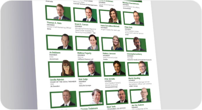 41 Peter Daly MEMBER Vice President Global Enhanced Customer Service AT&T Thomas A. Bata MEMBER Global Chief Marketing Officer Bata Irene Cervellera Micheli MEMBER Angel Investor for start-ups Grant S. Carson MEMBER Managing Director Regional Head Global Subsidiaries Banking Group EMEA - Citi Christophe Leclercq MEMBER Founder Euractiv media & Fondation Euractiv Helena Jansson MEMBER SVP Finance Europe FedEx Melissa Fogarty MEMBER Partner Clifford Chance LLP Jo Deblaere MEMBER COO Accenture Martin Spurling MEMBER Group General Manager & Chief Remediation Officer Latin America HSBC Group Dirk Ostijn MEMBER CEO MetLife Europe Frits Scholte MEMBER Vice President Sales & Marketing Europe ManpowerGroup Cecilia Nykvist CHAIR OF THE CEOs / MEMBER CEO JA Sweden Shane M. Spyak MEMBER Staff Vice President EMEAI Sales Delta Air Lines, Inc. Jan Van Autreve MEMBER CEO and Member of the Board of Directors NN Belgium Thomas Tindemans MEMBER Chairman Hill + Knowlton Strategies Mark Torfs TREASURER / EX-OFFICIO Program Director Deloitte University EMEA Deloitte Caroline Jenner EX-OFFICIO CEO JA Europe Brynhild Vinskei MEMBER Chief Markets Officer 24i Media Adam Warby CHAIRMAN CEO Avanade Johan H Andresen MEMBER Owner and Chairman FERD Nikolaas Baeckelmans MEMBER Vice President / EU Affairs ExxonMobil Michel De Wolf SECRETARY / VICE-CHAIR Honorary Dean Louvain School of Management MORE ABOUT JA EUROPE JAs LEADERSHIP