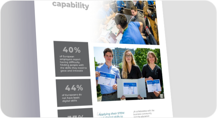34 JA collaborates with the business community and the education systems to bridge the gap between demand and supply for skills, knowledge and attitudes. ENHANCING STEM and digital capability Applying their STEM and digital skills to real-world problems and business opportunities enables young people develop those crucial (and in-demand) entrepreneurial skills. PREPARING FOR THE FUTURE OF JOBS ENHANCING STEM AND DIGITAL CAPABILITY of those in the labour force do not have basic digital skills while 90% of jobs will require at least basic digital skills 3 7 % of Europeans do not have basic digital skills 4 4% of European employers report having diff iculty f inding people with the skills they need to grow and innovate 4 0 %