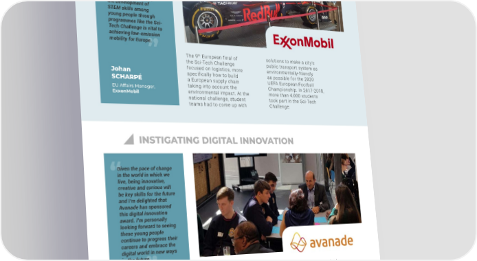 35 The 9 th European final of the Sci-Tech Challenge focused on logistics, more specifically how to build a European supply chain taking into account the environmental impact. At the national challenge, student teams had to come up with solutions to make a citys public transport system as environmentally-friendly as possible for the 2020 UEFA European Football Championship. In 2017-2018, more than 4,000 students took part in the Sci-Tech Challenge. EU Affairs Manager, ExxonMobil Johan SCHARP ENCOURAGING THE USE OF STEM KNOWLEDGE FOR A GOOD CAUSE Avanade has been collaborating with JA Europe since 2016, supporting its programmes with the aim to teach young people about the world of technology. In the first year of the partnership, 102 Avanade volunteers supported 1,124 girls across Brazil, Italy, Norway, Spain and Sweden. Avanade launched the Digital Innovation Signature Award within the JA Europe Enterprise Challenge to recognise the young entrepreneurs who were best able to put their digital skills into practice to conceive an innovative business idea or concept. CEO, Avanade Adam WARBY INSTIGATING DIGITAL INNOVATION PREPARING FOR THE FUTURE OF JOBS ENHANCING STEM AND DIGITAL CAPABILITY Given the pace of change in the world in which we live, being innovative, creative and curious will be key skills for the future and Im delighted that Avanade has sponsored this digital innovation award. Im personally looking forward to seeing these young people continue to progress their careers and embrace the digital world in new ways in the future. New technologies and innovative ideas will be critical to tackle the energy challenges of the future. Therefore, supporting the development of STEM skills among young people through programmes like the Sci- Tech Challenge is vital to achieving low-emission mobility for Europe.