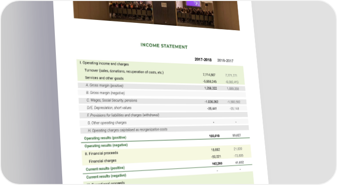43 2017-2018 2016-2017 I. Operating income and charges Turnover (sales, donations, recuperation of costs, etc.) Services and other goods A. Gross margin (positive) B. Gross margin (negative) C. Wages, Social Security, pensions D/E. Depreciation, short values F. Provisions for liabilities and charges (withdrawal) G. Other operating charges H. Operating charges caiptalised as reorganization costs Operating results (positive) Operating results (negative) II. Financial proceeds Financial charges Current results (positive) Current results (negative) III. Exceptional proceeds Exceptional costs Profit for the year (positive) Loss for the year (negative) Solidarity Fund (withdrawal) Loss brought forward from preceding period Loss/Profit to be carried forward 7,114,567 -5,858,245 1,256,322 -1,036,262 -26,441 - 193,619 18,662 -50,021 162,260 - 162,260 -71,186 91,074 7,771,771 -6,082,413 1,689,358 -1,560,582 -35,148 - 93,627 21,830 -73,805 41,652 - 41,652 -112,838 -71,186 INCOME STATEMENT MORE ABOUT JA EUROPE