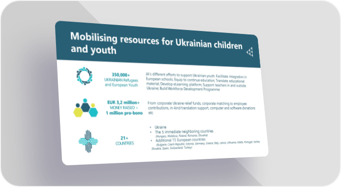 Mobilising resources for Ukrainian children and youth 350,000+ JA's different efforts to support Ukrainian youth: Facilitate integration in UKRAINIAN Refugees European schools; Equip to continue education; Translate educational and European Youth material; Develop eLearning platform; Support teachers in and outside Ukraine; Build Workforce Development Programme EUR 3,2 million+ From corporate Ukraine relief funds, corporate matching to employee MONEY RAISED + contributions, in-kind translation support, computer and software donations 1 million pro-bono etc • Ukraine • The 5 immediate neighboring countries 21+ (Hungary, Moldova, Poland, Romania, Slovakia) COUNTRIES • Additional 15 European countries (Bulgaria, Czech Republic, Estonia, Germany, Greece, Italy, Latvia, Lithuania, Malta, Portugal, Serbia, Slovakia, Spain, Switzerland, Turkey)