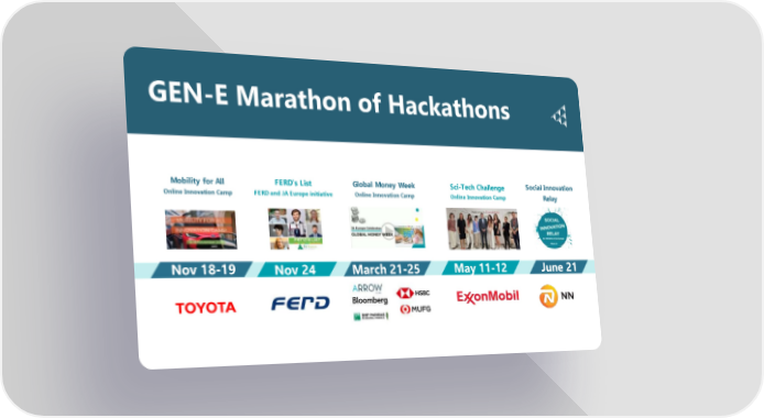 GEN-E Marathon of Hackathons Mobility for All FERD’s List Global Money Week Sci-Tech Challenge Social Innovation Online Innovation Camp FERD and JA Europe initiative Online Innovation Camp Online Innovation Camp Relay Nov 18-19 Nov 24 March 21-25 May 11-12 June 21