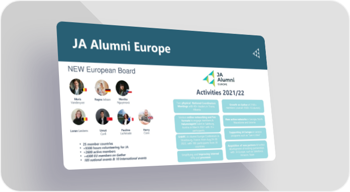 JA Alumni Europe NEW European Board Activities 2021/22 Moris Ragna Jebsen Monika Vandevyver Nguyenová Two physical National Coordinators Growth on Gatherof 2100+ Meetings with 40+ leaders in Tirana, members (overall 4300+ EU alumni) Albania Various online networking and fun New active networksin Georgia, North formatsto engage members.& Macedonia and Estonia #alumnispirit Event in Salzburg, Loran Geskens Umut Pauline Harry Austria in March 2022 with 35+ Canli Lachérade Conn participants Supporting JA Europeon various SHAPE JA Alumni Europe Conference in programs such as