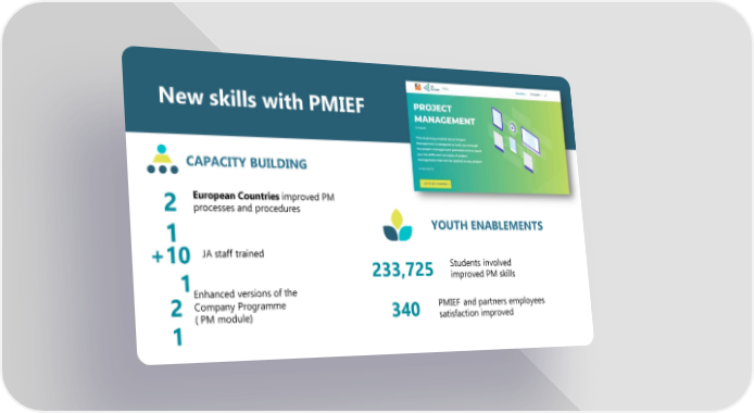 New skills with PMIEF CAPACITY BUILDING European Countries improved PM 2 processes and procedures 1 YOUTH ENABLEMENTS +10 JA staff trained 233,725 Students involved 1 improved PM skills Enhanced versions of the 2 Company Programme 340 PMIEF and partners employees 1 (PM module) satisfaction improved
