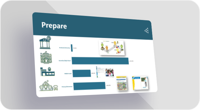 Prepare Graduate/University 48,181 Secondary/High School 2,025,495 Middle Grade 605,597 Primary/Elementary 1,084,858