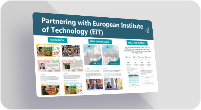 Partnering with European Institute of Technology (EIT) FOODATHON GIRLS GO CIRCULAR SKILLS FOR FUTURE With mentorship from industry leaders, more than 1000 students per year across the EU take on the challenge to build a more sustainable European society focusing on 4 sectors.