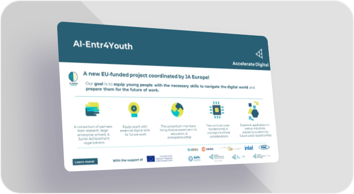 AI-Entr4Youth Accelerate Digital A new EU-funded project coordinated by JA Europe! Our goal is to equip young people with the necessary skills to navigate the digital world and prepare them for the future of work. A consortium of partners Equip youth with The consortium members The curricula cover Explore AI applications in from research, large- essential digital skills bring diverse expertise in AI, fundamental AI various industries, enterprise, schools, & for future work education, & concepts & ethical preparing students for Junior Achievement entrepreneurship considerations future career opportunities organizations Learn more! With the support of