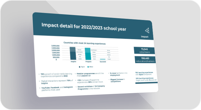 Impact detail for 2022/2023 school year Impact 72,545 volunteers 108,460 educators/trainers • 76% growth of social media learning • Modular programmes are still the • 2x more facilitation into 76% learning experiences experiences compared to 2022 most popular LX employment with digital component • Digital interactions represent70% of • +12% Company Programme • Biggest increase in 59% learning experiences Inspire experiences +30% contact hours competitions target youthunder 15 years old • YouTube, Facebook andInstagram • Several variations of JA Company platforms most used Programme in the network