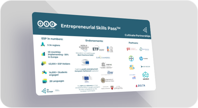 Entrepreneurial Skills PassTM Cultivate Partnerships ESP in numbers: Endorsements: . Partners: 5 JA regions 45 countries Education 4.0 Lighthouses Implementing - 50% Best Practice of 2023 in Europe 43,000 + ESP Holders Fighting youth unemployment 14,000 + Students European Parliament resolution engaged 28 Languages The ESP as a reference on how entrepreneurship is taught and learnt as a key competence by the European Commission.