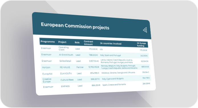 European Commission projects Programme Project Role Contract JA countries involved JA Europe Amount funding Erasmus+ Operating Lead 175.000 € n/a 175.000€ Grant Erasmus+ AI-Entr4Youth Lead 788.202 € Italy, Spain andPortugal 242.105 € Latvia,Ireland, Czech Republic, Austria, Erasmus+ Skills4Retail Lead 3.957.154 € Romania, Portugal, Hungary and Malta 623.845 € Norway, Belgium,Italy, Bulgaria, Portugal, Horizon RE-VALUE Partner 12.762.052 € Turkiye, Czech Republic, Serbia and Slovenia 683.545 € EuropAid EU4YOUTH Lead 874.995 € Moldova, Ukraine,Georgia and Lithuania 126.134 € Creative Cultural Bees Lead 999.307 € Italy, Cyprus and Bulgaria 194.778 € Europe Erasmus+ EMPASS Lead 866.255 € Spain, Greece and Romania 284.599 €