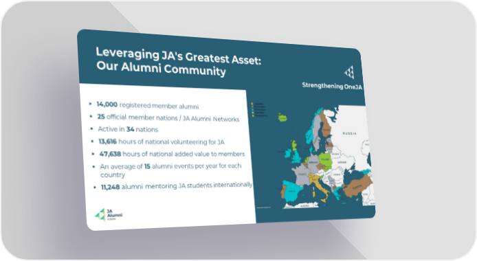 Leveraging JA's Greatest Asset: Our Alumni Community Strengthening OneJA JA Alumni Europe in numbers ▪ 14,000 registered member alumni ▪ 25 official member nations / JA Alumni Networks ▪ Active in 34 nations ▪ 13,616 hours of national volunteering for JA ▪ 47,638 hours of national added value to members ▪ An average of 15 alumni events per year for each country ▪ 11,248 alumni mentoring JA students internationally