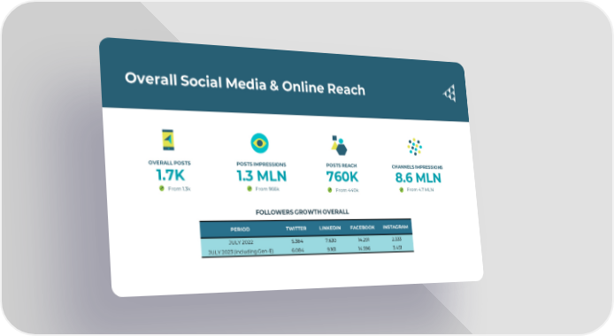 Overall Social Media & Online Reach OVERALL POSTS POSTS IMPRESSIONS POSTS REACH CHANNELS IMPRESSIONS 1.7K 1.3 MLN 760K 8.6 MLN From 1.3k From 966k From 440k From 4.7 MLN FOLLOWERS GROWTH OVERALL PERIOD TWITTER LINKEDIN FACEBOOK INSTAGRAM JULY 2022 5.384 7.630 14.291 2.333 JULY 2023 (including Gen-E) 6.084 9.161 14.596 3.451