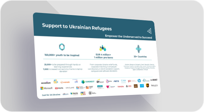 Support to Ukrainian Refugees Empower the Underserved to Succeed 150,000+ youth to be inspired EUR 4 million+ 20+ Countries 1 million pro-bono 25,000+ to be prepared through hands-on From corporate Ukraine relief funds, Ukraine, Belgium, Bulgaria, Czech Republic, Estonia, learning experiences corporate matching to employee Germany, Greece, Hungary, Italy, Latvia, Lithuania, Malta, 7,000 increased connectivity thanks to laptop contributions, in-kind translation support, Moldova, Poland, Portugal, Romania, Serbia, Slovakia, donation computer and software donations Spain, Switzerland, Türkiye Just for JA Ukraine:
