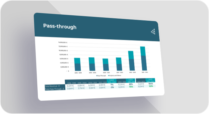 Pass-through 14,000,000 € 12,000,000 € 10,000,000 € 8,000,000 € 6,000,000 € 4,000,000 € 2,000,000 € - € 2018 - 2019 2019 - 2020 2020 - 2021 2021 - 2022 2022 - 2023 2023 - 2024 Pass Through Projects and Others CAGR CAGR CAGR 2018 -2019 2019 - 2020 2020 -2021 2021 -2022 2019 - 2022 2022 -2023 2019 –2023 2023-2024 2019 –2024 Total Revenue-€ 6.5M € 6.8M€ 6.3M € 6.9M € 7% 10.5M€ 63% 13.2M€ 104% Total Pass-Through-€ 3.6M€ 3.7M€ 3.5M€ 3.6M € -3% 6.2M € 70% 8.2M € 123%