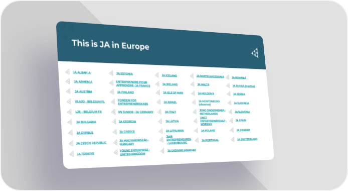 This is JA in Europe JA ALBANIA JA ESTONIA JA ICELAND JA NORTH MACEDONIA JA ROMANIA JA ARMENIA ENTERPRENDRE POUR JA IRELAND JA MALTA JA RUSSIA (inactive) APPRENDRE- JA FRANCE JA AUSTRIA JA FINLAND JA ISLE OF MAN JA MOLDOVA JA SERBIA VLAJO - BELGIUM FL FONDEN FOR JA ISRAEL JA MONTENEGRO JA SLOVAKIA ENTREPRENØRSKABS (observer) LJE – BELGIUM FR IW JUNIOR - JA GERMANY JA ITALY JONG ONDERNEMEN - JA SLOVENIA NETHERLANDS UNGT JA SPAIN JA BULGARIA JA GEORGIA JA LATVIA ENTREPRENØRSKAP - NORWAY JA CYPRUS JA GREECE JA LITHUANIA JA POLAND JA SWEDEN Jonk JA CZECH REPUBLIC JA MAGYARORSZÁG - ENTREPRENEUREN JA PORTUGAL JA SWITZERLAND HUNGARY - LUXEMBOURG JA TÜRKIYE YOUNG ENTERPRISE - JA UKRAINE (observer) UNITED KINGDOM