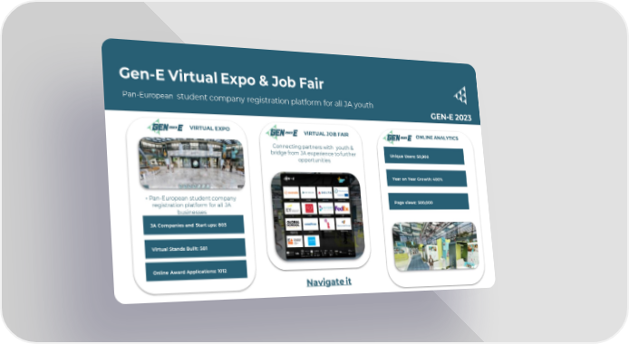 Gen-E Virtual Expo & Job Fair Pan-European student company registration platform for all JA youth GEN-E 2023 VIRTUAL EXPO VIRTUAL JOB FAIR ONLINE ANALYTICS Connecting partners with youth & bridge from JA experience to further Unique Users: 50,900 opportunities Year on Year Growth: 400% + Pan-European student company Page views: 500,000 registration platform for all JA businesses JA Companies and Start ups: 803 JA Companies and Start ups: 803 Virtual Stands Built: 581 Online Award Applications: 1012 Navigate it