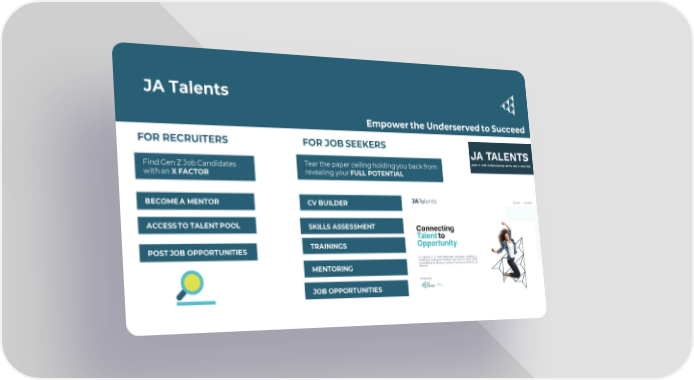JA Talents Empower the Underserved to Succeed FOR RECRUITERS FOR JOB SEEKERS Find Gen Z Job Candidates Tear the paper ceiling holding you back from with an X FACTOR revealing your FULL POTENTIAL BECOME A MENTOR CV BUILDER ACCESS TO TALENT POOL SKILLS ASSESSMENT POST JOB OPPORTUNITIES TRAININGS MENTORING JOB OPPORTUNITIES