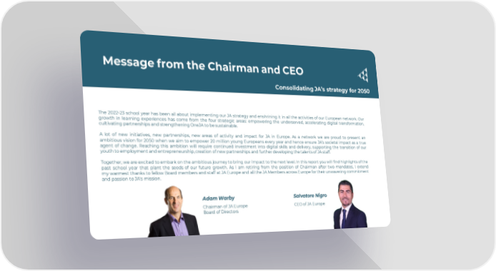 Message from the Chairman and CEO Consolidating JA’s strategy for 2050 The 2022-23 school year has been all about implementing our JA strategy and enshrining it in all the activities of our European network. Our growth in learning experiences has come from the four strategic areas: empowering the underserved, accelerating digital transformation, cultivating partnerships and strengthening OneJA to be sustainable. A lot of new initiatives, new partnerships, new areas of activity and impact for JA in Europe. As a network we are proud to present an ambitious vision for 2050 when we aim to empower 20 million young Europeans every year and hence ensure JA’s societal impact as a true agent of change. Reaching this ambition will require continued investment into digital skills and delivery, supporting the transition of our youth to employment and entrepreneurship, creation of new partnerships and further developing the talents of JA staff. Together, we are excited to embark on the ambitious journey to bring our impact to the next level. In this report you will find highlights of the past school year that plant the seeds of our future growth. As I am retiring from the position of Chairman after two mandates, I extend mywarmest thanks to fellow Board members and staff at JA Europe and all the JA Members across Europe for their unwavering commitment and passion to JA's mission. Adam Warby Salvatore Nigro Chairman of JA Europe CEO of JA Europe Board of Directors