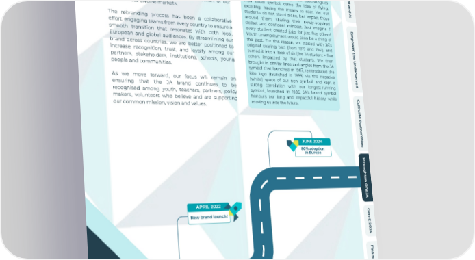 O v e r v i e w ONE LOGO, ONE JA A c c e l e r a t This year marked a significant milestone in our e D STORY BEHIND THE LOGO ongoing rebranding journey, as we continue to i g strengthen our global identity and align with our core i t a From the original Junior Achievement logos l values. With over 80% of the countries in Europe now a (launched in 1919 and 1941), which used wings as n fully aligned with our updated branding guidelines, d their visual symbol, came the idea of flying, A we are witnessing the successful unification of our excelling, having the means to soar. Yet our I brand across diverse markets. students do not stand alone, but impact those around them, sharing their newly-acquired E skillset and confident mindset. Just imagine if The rebranding process has been a collaborative m every student created jobs for just five others! effort, engaging teams from every country to ensure a p o Youth unemployment would soon be a thing of w smooth transition that resonates with both local, e the past. For this reason, we started with JA’s r European and global audiences. By streamlining our t original soaring bird (from 1919 and 1941), and h brand across countries, we are better positioned to e turned it into a flock of six (the JA student + five U increase recognition, trust, and loyalty among our others impacted by that student). We then n d partners, stakeholders, institutions, schools, young brought in similar lines and angles from the JA e r s people and communities. symbol that launched in 1967, reintroduced the e r kite logo (launched in 1955) via the negative v e (white) space of our new symbol, and kept a d As we move forward, our focus will remain on strong correlation with our longest-running ensuring that the JA brand continues to be symbol, launched in 1986. JA’s brand symbol recognised among youth, teachers, partners, policy C honours our long and impactful history while u makers, volunteers who believe and are supporting l moving us into the future. t i v our common mission, vision and values. a t e P a r t n e r s h i p JUNE 2024 s 80% adoption in Europe S t r e n g h t e n O n e J A APRIL 2022 G e New brand launch! n - E 2 0 2 4 F i n a n c i a l s A b o u t J A E u r o p e JA Europe - 2023/2024 Annual Report 33
