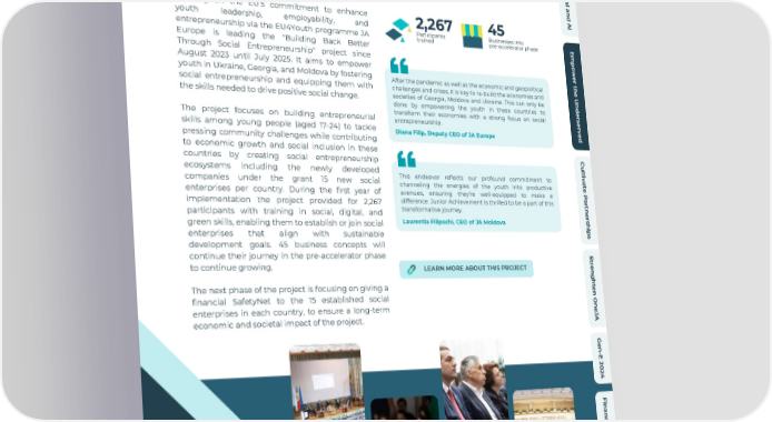 O v e r v i e w BUILDING BACK BETTER A c c e THROUGH ENTREPRENEURSHIP l e r a t e D i g i t a l a n d A I Building on the EU’s commitment to enhance 2,267 45 youth leadership, employability, and Participants Businesses into E entrepreneurship via the EU4Youth programme JA trained pre-accelerator phase m p Europe is leading the "Building Back Better o w Through Social Entrepreneurship" project since e r August 2023 until July 2025. It aims to empower t h youth in Ukraine, Georgia, and Moldova by fostering e After the pandemic as well as the economic and geopolitical U social entrepreneurship and equipping them with challenges and crises, it is key to re-build the economies and n d societies of Georgia, Moldova and Ukraine. This can only be the skills needed to drive positive social change. e done by empowering the youth in these countries to r s e transform their economies with a strong focus on social r The project focuses on building entrepreneurial v entrepreneurship. e d skills among young people (aged 17-24) to tackle Diana Filip, Deputy CEO of JA Europe pressing community challenges while contributing to economic growth and social inclusion in these C u countries by creating social entrepreneurship l t i v ecosystems including the newly developed a This endeavor reflects our profound commitment to t companies under the grant 15 new social e channeling the energies of the youth into productive P enterprises per country. During the first year of avenues, ensuring they’re well-equipped to make a a r difference. Junior Achievement is thrilled to be a part of this t implementation the project provided for 2,267 n transformative journey. e participants with training in social, digital, and r s h Laurentia Filipschi, CEO of JA Moldova green skills, enabling them to establish or join social i p s enterprises that align with sustainable development goals. 45 business concepts will S continue their journey in the pre-accelerator phase t r e to continue growing. LEARN MORE ABOUT THIS PROJECT n g h t e The next phase of the project is focusing on giving a n financial SafetyNet to the 15 established social O n enterprises in each country, to ensure a long-term e J A economic and societal impact of the project. G e n - E 2 0 2 4 F i n a n c i a l s A b o u t MOLDOVA J A E u r o p e JA Europe - 2023/2024 Annual Report 19
