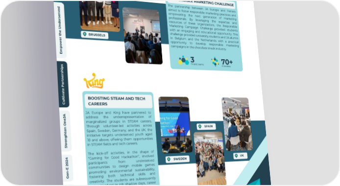 w e i v r e v O INNOVATION CAMPS I A d n a l a t i g i D e t a r e l e RESPONSIBLE MARKETING CHALLENGE c c A The partnership between JA Europe and Ferrero aimed to foster responsible marketing practices and empowering the next generation of marketing d professionals. By leveraging the expertise and e v resources of these organizations, the Responsible r e s Marketing Campaign Challenge provided students r e with an engaging and educational opportunity. This d n challenge provided university students and JA alumni U in Belgium and the Netherlands with a practical e BRUSSELS h t opportunity to develop responsible marketing r e campaigns in the chocolate snack industry. w o p m E 3 70+ Finalist teams Attendees s p i h s r e n t r a P e t a v i t BOOSTING STEAM AND TECH l u C CAREERS JA Europe and King have partnered to A J address the underrepresentation of e n marginalized groups in STEAM careers. O Through volunteer-led activities across n SPAIN e Spain, Sweden, Germany, and the UK, the t h initiative targets underserved youth aged g n 18 and above, offering them opportunities e r t in STEAM fields and tech careers. S The kick-off activities, in the shape of 4 "Gaming for Good Hackathon”, involved 2 0 UK SWEDEN participants from underserved 2 E communities to design mobile games - n promoting environmental sustainability, e G fostering both technical skills and creativity. The students are subsequently being involved in job shadow days, career s l a talks and office visits to discover the i c backstage of one of the largest gaming n a company! n i F 324 57 e p Students Volunteers o r u E A J t u o b A 2023/2024 Annual Report - JA Europe 24