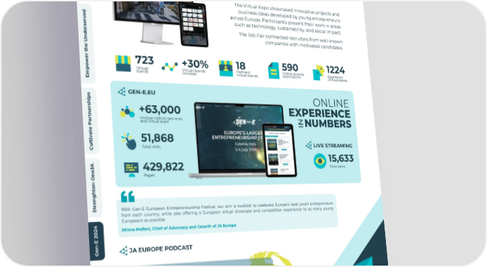 w e i v r e v O VIRTUAL EXPERIENCE I A d n a l a t i g i VIRTUAL EXPO D D e t N a JOB FAIR A r e l e c c The Virtual Expo showcased innovative projects and A business ideas developed by young entrepreneurs across Europe. Participants present their work in areas d such as technology, sustainability, and social impact. e v r e The Job Fair connected recruiters from well-known s r e companies with motivated candidates. d n U e h t r e 590 1224 723 18 +30% w Online awards Partners' Registered o Virtual stands Virtual applications virtual stands JA businesses p increase stands m E GEN-E.EU s p ONLINE i h s r e EXPERIENCE +63,000 n t Unique visitors gen-e.eu r N and virtual expo a NUMBERS I P e t a v i 51,868 t l LIVE STREAMING u Total visits C 15,633 A Total views J 429,822 e n Pages O n e t h g n e r t With Gen-E European Entrepreneurship Festival, our aim is twofold: to celebrate Europe’s best youth entrepreneurs S from each country, while also offering a European virtual showcase and competition experience to as many young Europeans as possible. 4 2 Minna Melleri, Chief of Advocacy and Growth of JA Europe 0 2 E - n e JA EUROPE PODCAST G s l a i c JA Europe Podcast n a n How to start a career in digital i F innovation? e 15.09 03.45 p o r u E A J t u o Listen to JA Europe Podcast by b A clicking on your favourite platform: 2023/2024 Annual Report - JA Europe 40