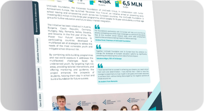 w e i v r e v O PREVENTING SCHOOL DROPOUT I A d AND EMPOWERING YOUTH n a l a t i With g i D e t a r e l e c c 3 10 415K 6,5 MLN A Years Countries Students Budget d UniCredit Foundation, the Corporate Foundation of UniCredit Group, in collaboration with Junior e v Achievement Europe, has launched "Re-power Your Future", an initiative aimed at preventing early r e s school leaving and empowering youth across ten European countries. The UniCredit Foundation is r e d investing €6.5 million in this three-year programme, which targets 10–19-year-old students, a critical age n U group for further education and future labour market integration. e h t r e The initiative has been rolled out in Austria, w o Bulgaria, Czech Republic, Germany, The Foundation’s partnership with JA Europe will help us to do this by p directly combatting one of the major challenges our continent’s educators m Hungary, Italy, Romania, Serbia, Slovakia, E face at this moment: school dropout rates, which stifle employment and Slovenia. In the first year of the "Re- opportunities and leave a lasting impact on lifetime earnings. Power Your Future" partnership 10 Andrea Orcel, Chairman of UniCredit Foundation s participating countries developed a p i h multifacted set of strategies to adress the s r e needs of the most vulnerable youth and n t mitigate school drop-out risk. r Together, UniCredit Foundation and JA Europe have the ambition to a P change the landscape of Europe’s education systems by significantly e t preventing and reducing the current rates of school dropout. By combining skills-building programmes a v i and real-world exposure it addresses the Salvatore Nigro, CEO of JA Europe t l u multifaceted challenges faced by C underserved youth. By targeting high-risk areas, providing tailored interventions, and A J offering mentoring and guidance, the I have learned that to succeed in achieving your dreams, you need a lot of e hard work and determination. I have learned that I need to have the n project enhances the prospects of O courage to experiment, to trust myself, to set goals, and to seek resources students, helping them stay in school and n to achieve them, without being discouraged by the negative opinions of e t build a foundation for future success. those around me. h g JA student from Romania n e r t S 4 2 0 2 E - n e G s l a i c n a n i F e p o r u E A J t u o b A 2023/2024 Annual Report - JA Europe 16