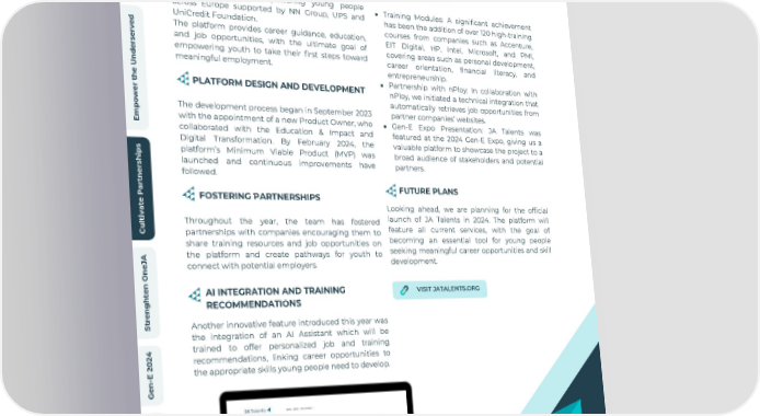 w e i v r e v O A PLATFORM TO EMPOWER I A d YOUTH ACROSS EUROPE n a l a t i Thanks g i D e t a r Over the past year, a dedicated team has been e KEY MILESTONES l e working to design and develop the JA Talents c c platform, aimed at empowering young people A Training Modules: A significant achievement across Europe supported by NN Group, UPS and has been the addition of over 120 high-training UniCredit Foundation. courses from companies such as Accenture, d The platform provides career guidance, education, e EIT Digital, HP, Intel, Microsoft, and PMI, v r and job opportunities, with the ultimate goal of e covering areas such as personal development, s r empowering youth to take their first steps toward e career orientation, financial literacy, and d meaningful employment. n entrepreneurship. U e Partnership with nPloy: In collaboration with h PLATFORM DESIGN AND DEVELOPMENT t nPloy, we initiated a technical integration that r e automatically retrieves job opportunities from w o The development process began in September 2023 partner companies’ websites. p m with the appointment of a new Product Owner, who Gen-E Expo Presentation: JA Talents was E collaborated with the Education & Impact and featured at the 2024 Gen-E Expo, giving us a Digital Transformation. By February 2024, the valuable platform to showcase the project to a s platform’s Minimum Viable Product (MVP) was broad audience of stakeholders and potential p i h launched and continuous improvements have partners. s r e followed. n t r FUTURE PLANS a P FOSTERING PARTNERSHIPS e t Looking ahead, we are planning for the official a v i launch of JA Talents in 2024. The platform will t l Throughout the year, the team has fostered u feature all current services, with the goal of C partnerships with companies encouraging them to becoming an essential tool for young people share training resources and job opportunities on seeking meaningful career opportunities and skill the platform and create pathways for youth to A J development. connect with potential employers. e n O n e VISIT JATALENTS.ORG AI INTEGRATION AND TRAINING t h g RECOMMENDATIONS n e r t Another innovative feature introduced this year was S the integration of an AI Assistant which will be trained to offer personalized job and training 4 2 recommendations, linking career opportunities to 0 2 the appropriate skills young people need to develop. E - n e G s l a i c n a n i F e p o r u E A J t u o b A 2023/2024 Annual Report - JA Europe 22
