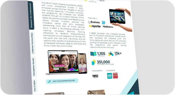 w e i v r e v O SUPPORTING UKRAINIAN I A REFUGEES ACROSS EUROPE d n a l a t With i g i D e t a r e l 14 98,000 +1,8 MLN e c Countries involved Students c Learning hours A The UPLIFT Youth initiative, launched by UNICEF d and Junior Achievement Europe in 2022, e v r empowers young Ukrainian refugees to rebuild e s their futures. Spanning 11 European countries, r e d the programme has impacted over 351,000 n Featured in: U students through JA Europe’s first-ever online e h digital educational campaign and 98,000 young t r people through in-person activities like e w innovation camps and skills workshops, o p representing more than 1.8 million learning m E hours. It offers a life-changing pathway, from inspiring campaigns featuring inspiring A digital campaign, was a targeted approach influencers to hands-on entrepreneurship s with 34 influencers sharing their success stories p i training and cultural integration all the way into that resonated with displaced youth and h s the youth with vital skills, internships, and job r encouraging self-paced learning. This campaign e n opportunities, transforming displaced youth into t igniting the displaced youth’s motivation to join r a empowered individuals ready to contribute and the programme and explore learning P e thrive in their new communities. t opportunities at their own pace. a v i t l u C 13k+ 1,105 Users Learning hours A J e n 351,000 O Youth reached via online campaign n e t h g n e Shotlisted for: Awarded at: r t S 4 2 VISIT TOGETHERWITHJA.ORG 0 2 E - n e G s l a i c n a BULGARIA n i F e p o r u E A J POLAND CZECH t u o b A 2023/2024 Annual Report - JA Europe 18