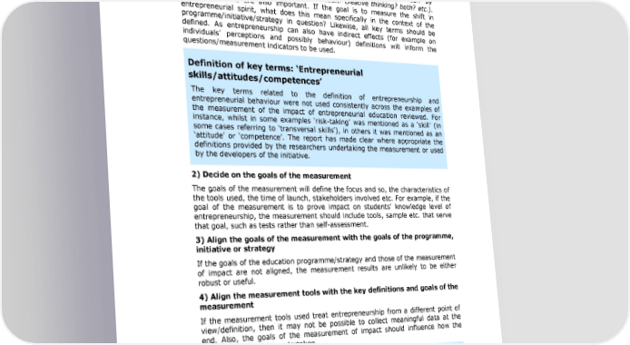 Entrepreneurship Education: A road to success respondents), there are some key points that should be kept into consideration and that apply in most cases. 1) Decide on the definition of key terms Entrepreneurship education covers a broad range of elements and its impacts are linked to changes in attitudes, skills and behaviour. So, before choosing the methodological approach and designing the tool(s) to be used for data collection, the key stakeholders should agree on what they mean by entrepreneurship impact (e.g. is it firm creation? creative thinking? both? etc.). Other definitions are also important. If the goal is to measure the shift in entrepreneurial spirit, what does this mean specifically in the context of the programme/initiative/strategy in question? Likewise, all key terms should be defined. As entrepreneurship can also have indirect effects (for example on individuals9 perceptions and possibly behaviour) definitions will inform the questions/measurement indicators to be used. Definition of key terms: 8Entrepreneurial skills/attitudes/competences9 The key terms related to the definition of entrepreneurship and entrepreneurial behaviour were not used consistently across the examples of the measurement of the impact of entrepreneurial education reviewed. For instance, whilst in some examples 8risk-taking9 was mentioned as a 8skill9 (in some cases referring to 8transversal skills9), in others it was mentioned as an 8attitude9 or 8competence9. The report has made clear where appropriate the definitions provided by the researchers undertaking the measurement or used by the developers of the initiative. 2) Decide on the goals of the measurement The goals of the measurement will define the focus and so, the characteristics of the tools used, the time of launch, stakeholders involved etc. For example, if the goal of the measurement is to prove impact on students9 knowledge level of entrepreneurship, the measurement should include tools, sample etc. that serve that goal, such as tests rather than self-assessment. 3) Align the goals of the measurement with the goals of the programme, initiative or strategy If the goals of the education programme/strategy and those of the measurement of impact are not aligned, the measurement results are unlikely to be either robust or useful. 4) Align the measurement tools with the key definitions and goals of the measurement If the measurement tools used treat entrepreneurship from a different point of view/definition, then it may not be possible to collect meaningful data at the end. Also, the goals of the measurement of impact should influence how the measurement will be undertaken. In the UPI case study in Slovenia, four distinct samples, reflecting different target groups were developed to serve the goal of the measurement of impact, which was to assess the impact of the UPI courses on students and mentors. 5) Adjust and test the tools and questions used to the target group It is important to adjust the questions9 content and language to the target group (age; educational background etc.). For example, in the UPI case study, the questionnaire was first tested to ensure it was suitable for pupils. Changes were made before launching the final survey instrument. Different questionnaires for 79