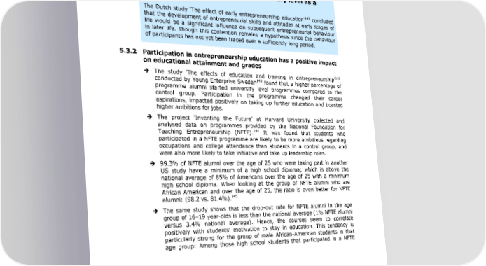 Entrepreneurship Education: A road to success 140 The Dutch study 8The effect of early entrepreneurship education9 examined the effect of entrepreneurship education on primary school pupils9 skills and attitudes. The study measured improvements of pupils regarding self- efficiency, need for achievement, risk taking, persistence, analysing, pro- activity, creativity and found a significant positive effect especially on non- cognitive entrepreneurial skills of primary school children. Developing entrepreneurial skills at primary level as a basis for life 141 The Dutch study 8The effect of early entrepreneurship education9 concluded that the development of entrepreneurial skills and attitudes at early stages of life would be a significant influence on subsequent entrepreneurial behaviour in later life. Though this contention remains a hypothesis since the behaviour of participants has not yet been traced over a sufficiently long period. 5.3.2 Participation in entrepreneurship education has a positive impact on educational attainment and grades The study 9The effects of education and training in entrepreneurship9142 143 conducted by Young Enterprise Sweden found that a higher percentage of programme alumni started university level programmes compared to the control group. Participation in the programme changed their career aspirations, impacted positively on taking up further education and boasted higher ambitions for jobs. The project 8Inventing the Future9 at Harvard University collected and analysed data on programmes provided by the National Foundation for 144 Teaching Entrepreneurship (NFTE). It was found that students who participated in a NFTE programme are likely to be more ambitious regarding occupations and college attendance than students in a control group, and were also more likely to take initiative and take up leadership roles. 99.3% of NFTE alumni over the age of 25 who were taking part in another US study have a minimum of a high school diploma; which is above the national average of 85% of Americans over the age of 25 with a minimum high school diploma. When looking at the group of NFTE alumni who are African American and over the age of 25, the ratio is even better for NFTE 145 alumni: (98.2 vs. 81.4%). The same study shows that the drop-out rate for NFTE alumni in the age group of 16319 year-olds is less than the national average (1% NFTE alumni versus 3.4% national average). Hence, the courses seem to correlate positively with students9 motivation to stay in education. This tendency is particularly strong for the group of male African-American students in that age group: Among those high school students that participated in a NFTE 140 Rosendahl Huber, L. et al. (2012) The effect of early entrepreneurship education 141 ibid 142 The effects of education and training in entrepreneurship 3 A long-term study of JA Sweden Alumni labour potential and business enterprise. 143 Please note: While the official name of the organisation is 8Young Enterprise Sweden9, the report 8The Effects of Education and Training in Entrepreneurship9 refers to Junior Achievement (JA) Sweden. 144 Nakkula et al. (2004): Initiating, leading and feeling in control of one9s fate: Findings from the 2002-2003 study of NFTE in six Boston Public High Schools. Harvard University. Graduate School of Education 145 Beary, Vanessa E. (2013): The NFTE Difference: Examining the Impact of Entrepreneurship Education. 62