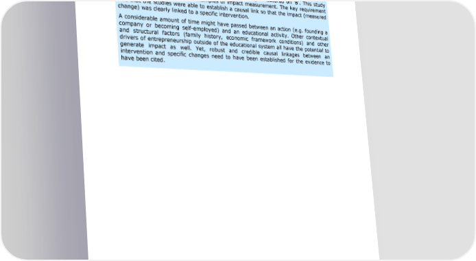 Entrepreneurship Education: A road to success intervention (strategy, measure, etc.), linked to the global/general objectives of 3 the intervention. For the purpose of this study, the use of the term 8impact9 was not restricted to 8global impact9. In line with the definition above, it was often used to refer to immediate results and intermediate outcomes. Impact measurement An impact measurement was taken to be evidence from a study or a research project which shows that initiative 8A9 is a cause of the change measured on 8B9. This study draws evidence from several examples of impact measurement. The key requirement was that the studies were able to establish a causal link so that the impact (measured change) was clearly linked to a specific intervention. A considerable amount of time might have passed between an action (e.g. founding a company or becoming self-employed) and an educational activity. Other contextual and structural factors (family history, economic framework conditions) and other drivers of entrepreneurship outside of the educational system all have the potential to generate impact as well. Yet, robust and credible causal linkages between an intervention and specific changes need to have been established for the evidence to have been cited. 3 This definition was inspired by the guide 8Evaluating EU activities 3 A practical guide for the Commission services. 4