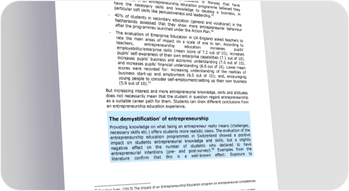 Entrepreneurship Education: A road to success Students that participated in the Spanish 8E-Vitamin9-programme had statistically significant higher scores than the control group in self- 43 efficacy, pro-activeness, risk-taking and locus of control. As a consequence of the three programmes in Switzerland, students self- assessed that their skills relevant to developing a business idea and exploiting an opportunity improved 3 they achieved higher scores in post- 44 tests than in pre-tests. The majority of upper secondary students in Norway that have participated in an entrepreneurship education programme believed they have the necessary skills and knowledge to develop a business, in 45 particular soft skills like persuasiveness and leadership. 40% of students in secondary education (general and vocational) in the Netherlands assessed that they show more entrepreneurial behaviour 46 after the programmes launched under the Action Plan. The evaluation of Enterprise Education in UK-England asked teachers to rate the main areas of impact on a scale of one to ten. According to teachers, entrepreneurship education increases pupils9 employability/enterprise skills (mean score of 7.2 out of 10); increases pupils9 self-awareness of their own enterprise capabilities (7.1 out of 10), increases pupils9 business and economic understanding (7.0 out of 10), and increases pupils9 financial understanding (6.6 out of 10). Lower mean scores were recorded for: increasing understanding of the realities of business start-up and employment (6.0 out of 10); and, encouraging young people to consider self-employment/setting up their own business 47 (5.9 out of 10). But increasing interest and more entrepreneurial knowledge, skills and attitudes does not necessarily mean that the student in question regard entrepreneurship as a suitable career path for them. Students can draw different conclusions from an entrepreneurship education experience. The demystification9 of entrepreneurship Providing knowledge on what being an entrepreneur really means (challenges, necessary skills etc.) offers students more realistic views. The evaluation of the entrepreneurship education programmes in Switzerland showed a positive impact on students entrepreneurial knowledge and skills, but a slightly negative effect on the number of students who declared to have 48 entrepreneurial intentions (pre- and post-survey). Examples from the literature confirm that this is a well-known effect: Exposure to 43 Sanchez Ivan. (2013) The Impact of an Entrepreneurship Education program on entrepreneurial competences and intention 44 The study focused on four types of entrepreneurship-related human-capital assets: entrepreneurship-related personality traits, beliefs, entrepreneurial knowledge and entrepreneurial competencies. For three out of these four areas (excluding entrepreneurial knowledge), key variables were identified and measured through a test with multiple self-reported items measured on a five-point Likert scale i.e. answers were rated on a scale of 1 to 5. 45 Johansen, V. et al. (2012) =Entreprenørskap i utdanningen og oppnåelse av læringsmål= 46 Panteia (2013) Spoor I: eindbestemming bereikt? Eindevaluatie 8spoor 19 projecten Ondernemerschap en Onderwijs 47 McLarty et al. (2010) Evaluation of Enterprise Education in England 48 Volery et al. (2013) The impact of entrepreneurship education on human capital at upper-secondary level; Journal of Small Business Management 51 (3), pp. 429-0; doi: 10.1111/jsbm.12020 32