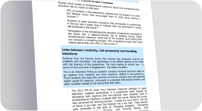 Entrepreneurship Education: A road to success entrepreneurship education can also have counter-effects on the 49 entrepreneurial intentions of participants. Such findings can be interpreted through the 8demystification lens9: Gaining better insights helps students to make better informed career choices. This may mean that some students decide that being an entrepreneur is not for them. These students might be better placed to become an 8intrapreneur9 3 an entrepreneurial employee. To increase the intention to start a business: Studies which looked at entrepreneurial intentions found that entrepreneurship education had an impact on that level. 30% of students in the Netherlands believed that the projects run under the National Action Plan encouraged them to think about starting a 50 business. Students of upper secondary education that participated in programmes in Norway had a higher level of intention than non-participants in being 51 self-employed in the future. Participation in the entrepreneurship education programmes connected to the Action Plan in Belgium-Flanders led to students having higher entrepreneurial intentions. While half of the students found having their own company a compelling thought; 33% of students thought they would 52 indeed realise that wish (20% in pre3survey). Links between creativity, risk-propensity and founding intentions Evidence from the Flemish Action Plan showed that graduates improve on creativity and innovation. The significance of the effects seemed to be linked with the intensity of the programme. The more intense an activity was - in terms of time and level of engagement - the higher the effect. This is an important finding as students9 company founding intentions seem to go together with creativity and other indicators related to risk-propensity. Those students that state their intention to found a company also self-assessed higher values for creativity, willingness to undertake international mobility and other variables related to risk-taking than their peers. The 2012 FFE-YE study from Denmark measured attitudes of upper secondary students participating in a programme which focused on developing both cognitive and non-cognitive skills. Students9 level of entrepreneurial intentions increased after the course. Before the course, they perceived the following barriers: 8it takes too much effort9, 8the risk of failure is too high9 and 8the financial risk is too high9. These barriers were connected to the skills of 8Managing ambiguity9, 8Marshalling resources9, 8Creativity9, 8Planning9, and 8Financial literacy9. Girls participating in the programme improved greatly on 8Managing ambiguity9 and 8Marshalling resources9, while boys improved more on 49 Fayolle A., et al. (2006) Assessing the impact of entrepreneurship education programmes: a new methodology. Journal of European Industrial Training Vol. 30 No.9, 2006; pp. 701-720 50 Panteia (2013) Spoor I: eindbestemming bereikt? Eindevaluatie 8spoor 19 projecten Ondernemerschap en Onderwijs 51 Johansen, V. et al. (2012) =Entreprenørskap i utdanningen og oppnåelse av læringsmål= 52 Flanders DC Kenniscentrum (2009) Effecto: Stimuleren van ondernemershap in het secundair onderwijs 33