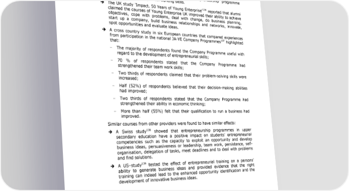 Entrepreneurship Education: A road to success Between 62% and 71% of students agreed/strongly agreed with the statements, participation 8has given me a very good insight into what business is all about9; 8taught me very well how to manage my money9; 8has improved considerably my problem-solving capacities9; and 9helped me to prepare for the future9. The most frequently mentioned learning effect was 9how to manage money9. 135 The Italian study 8Youth, economy and entrepreneurial spirit9 found that 83% of participants considered that the entrepreneurship programme contributed to develop team working skills. The UK study 9Impact. 50 Years of Young Enterprise9136 reported that alumni claimed the courses of Young Enterprise UK improved their ability to achieve objectives, cope with problems, deal with change, do business planning, start up a company, build business relationships and networks, innovate, spot opportunities and evaluate ideas. A cross country study in six European countries that compared experiences 137 from participation in the national JA-YE Company Programmes highlighted that: The majority of respondents found the Company Programme useful with regard to the development of entrepreneurial skills; 70 % of respondents stated that the Company Programme had strengthened their team work skills; Two thirds of respondents claimed that their problem-solving skills were increased; Half (52%) of respondents believed that their decision-making abilities had improved; Two thirds of respondents stated that the Company Programme had strengthened their ability in economic thinking; More than half (55%) felt that their qualification to run a business had improved. Similar courses from other providers were found to have similar effects: 138 A Swiss study showed that entrepreneurship programmes in upper secondary education have a positive impact on students9 entrepreneurial competencies such as the capacity to exploit an opportunity and develop business ideas, persuasiveness or leadership, team work, persistence, self- organisation, delegation of tasks, meet deadlines and to deal with problems and find solutions. 139 A US3study tested the effect of entrepreneurial training on a persons9 ability to generate business ideas and provided evidence that the right training can indeed lead to the enhanced opportunity identification and the development of innovative business ideas. 135 IARD (2007) Giovani, economia e spirito imprenditoriale 136 Kinston University London / Young Enterprise UK (2012) Impact - 50 years of Young Enterprise 137 JA-YE (2007)