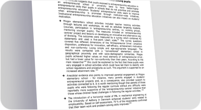 Entrepreneurship Education: A road to success To fertilise the local economy: The MIT sees itself as part of the local economy and defines its role as feeding into the (local) business structure. 4.3 Impact on the individual student This sub section discusses the findings on impact against the objectives related to the individual as formulated by the initiatives. 4.3.1 Enhanced entrepreneurial skills and attitudes among pupils Evidence collected suggests that pupils exposed to entrepreneurship education in an entrepreneurial school or university tend to have better/higher entrepreneurial skills than pupils in schools that do not prioritise and promote entrepreneurship education. Students9 entrepreneurial skills seem to improve when entrepreneurship is promoted through institution-wide initiatives. Institutional entrepreneurship education initiatives can also impact on students9 motivation. Misgav elementary school activities included teacher training activities through lectures and workshops, as well as activities targeting students (courses, participation in 8entrepreneurship centres, i.e. working groups, mentoring younger pupils). The measures included an 8entrepreneurship centres9 project and lessons on developing an innovative and alternative way of thinking. The outcomes were measured by a survey which contained 42 99 statements and used a five-point Likert scale. The survey questions covered five different dimensions of the 8Entrepreneurial Drive9: proactive disposition, preference for innovation, self-efficacy, achievement motivation and non-conformity (using simple and age-appropriate language). The results were compared with a