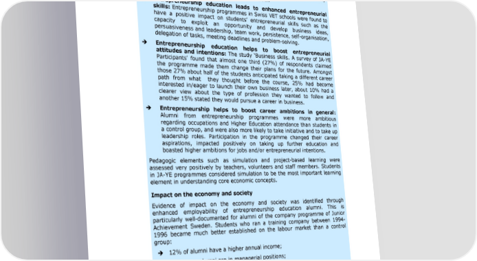 The main impacts of individual entrepreneurship education measures and initiatives Impact on students Impact on the individual students9 entrepreneurial skills and attitudes is one of the best researched aspects of impact of entrepreneurship education. Many studies provided evidence of impact on the individual: Entrepreneurship education leads to enhanced entrepreneurial skills: Entrepreneurship programmes in Swiss VET schools were found to have a positive impact on students9 entrepreneurial skills such as the capacity to exploit an opportunity and develop business ideas, persuasiveness and leadership, team work, persistence, self-organisation, delegation of tasks, meeting deadlines and problem-solving. Entrepreneurship education helps to boost entrepreneurial attitudes and intentions: The study 8Business skills. A survey of JA-YE Participants9 found that almost one third (27%) of respondents claimed the programme made them change their plans for the future. Amongst those 27% about half of the students anticipated taking a different career path from what they thought before the course, 25% had become interested in/eager to launch their own business later, about 10% had a clearer view about the type of profession they wanted to follow and another 15% stated they would pursue a career in business. Entrepreneurship helps to boost career ambitions in general: Alumni from entrepreneurship programmes were more ambitious regarding occupations and Higher Education attendance than students in a control group, and were also more likely to take initiative and to take up leadership roles. Participation in the programme changed their career aspirations, impacted positively on taking up further education and boasted higher ambitions for jobs and/or entrepreneurial intentions. Pedagogic elements such as simulation and project-based learning were assessed very positively by teachers, volunteers and staff members. Students in JA-YE programmes considered simulation to be the most important learning element in understanding core economic concepts. Impact on the economy and society Evidence of impact on the economy and society was identified through enhanced employability of entrepreneurship education alumni. This is particularly well-documented for alumni of the company programme of Junior Achievement Sweden. Students who ran a training company between 1994- 1996 became much better established on the labour market than a control group: 12% of alumni have a higher annual income; 44% more alumni are in managerial positions; alumni have a 20% less likelihood of being unemployed; alumni have a 20% increased likelihood of becoming self-employed. Participation in entrepreneurship education also has a positive impact on company founding activity. Overall, studies show that participants create more start-ups and ventures than control groups: For instance, according to a study on the impact of entrepreneurship education programmes in higher education in the US, graduates who have taken entrepreneurship courses are about five times more likely to select 57