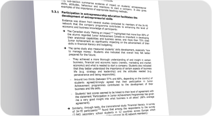 Entrepreneurship Education: A road to success entrepreneurship and to practice corporate social responsibility. This is expected to impact on the productivity of the workforce and to have a positive impact on the business world. NFTE supports social inclusion by specifically addressing youth from disadvantaged neighbourhoods or unemployed young people; aiming to support them in finding their paths to better personal economic and social circumstances through entrepreneurship. 5.3 Impact on the individual student This sub-section summarise evidence of impact on students9 entrepreneurial skills, attitudes, behaviour and intentions to start a company. It also gives examples of the importance of appropriate teaching methods. 5.3.1 Participation in entrepreneurship education facilitates the development of entrepreneurial skills Evidence was drawn from several studies conducted by members of the JA-YE network that the company programme contributes to enhancing the level of economic and business knowledge of participants: 133 The Canadian study 8Making an impact9 highlighted that more than 80% of the alumni regarded Junior Achievement Canada as important in developing their analytical capabilities and business sense; and more than 70% cited Junior Achievement as significantly impacting on the advancement of their skills in financial literacy and budgeting; The same study also measured students9 skills development, especially 8how to manage money9. Students also indicated that overall they felt better prepared for the future; They achieved a more thorough understanding of and insight in certain business, financial and economic topics (namely, marketing and market economy) and what is needed to start a company. Students also indicated that they better understood the importance of certain aspects of business life (e.g. strategy and leadership) and the attitudes needed (e.g. perseverance and being responsible); Around two thirds (between 57% and 68%, depending on the country) of students agreed/strongly agreed that their participation in Junior Achievement programmes contributed to the development of their business and life skills. Students9 test scores seemed to be linked to their level of agreement with the statement 8Participation in Junior Achievement Programmes has given me a very good insight into what business is all about9 (68% average agreement). Similarly, through tests, the transnational study 8Financial literacy. A survey of JA-YE participants9134 found that among the respondents to the survey (2,943 secondary school students in 12 countries across Europe which participated in programmes of the national JA-YE network members): 70.5% of the students understand the key influence of education and skills on their future income; 74.5% found it easy to understand basic money management (budgeting to save a certain amount of money); 133 The Boston Consulting Group (2011) 8Making an impact9. Assessing Junior Achievement of Canada9s valued creation= The Boston Consulting Group (2011) 134 JA-YE Europe (2010): Financial literacy. A survey of JA-YE participants 60
