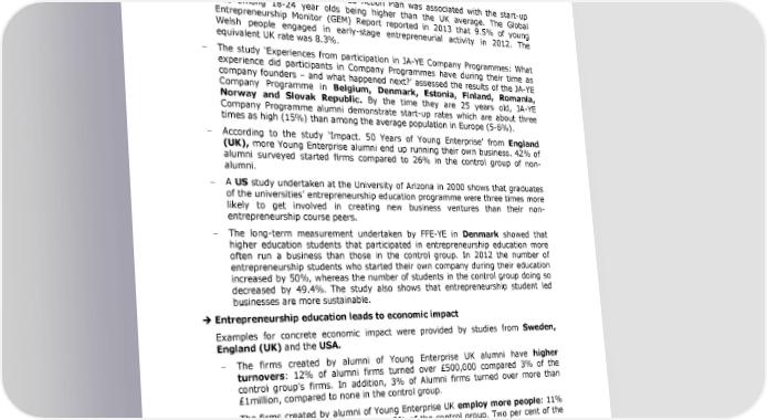 Entrepreneurship Education: A road to success Graduates from business schools in Norway with a major in entrepreneurship are between two and three times more likely to start a business than other graduates. Between 1997 and 2003, several measurements on possible correlations were undertaken. In 1997, it was found that three times more entrepreneurship education graduates started a business compared with other graduates. In later surveys, (2001 and 2003) the differences were found to be smaller. But entrepreneurship majors still remain more than twice as likely to start and own a business as graduates with other majors. In Wales (UK), the National YES Action Plan was associated with the start-up rate among 18-24 year olds being higher than the UK average. The Global Entrepreneurship Monitor (GEM) Report reported in 2013 that 9.5% of young Welsh people engaged in early-stage entrepreneurial activity in 2012. The equivalent UK rate was 8.3%. The study 8Experiences from participation in JA-YE Company Programmes: What experience did participants in Company Programmes have during their time as company founders 3 and what happened next?9 assessed the results of the JA-YE Company Programme in Belgium, Denmark, Estonia, Finland, Romania, Norway and Slovak Republic. By the time they are 25 years old, JA-YE Company Programme alumni demonstrate start-up rates which are about three times as high (15%) than among the average population in Europe (5-6%). According to the study 8Impact. 50 Years of Young Enterprise9 from England (UK), more Young Enterprise alumni end up running their own business. 42% of alumni surveyed started firms compared to 26% in the control group of non- alumni. A US study undertaken at the University of Arizona in 2000 shows that graduates of the universities9 entrepreneurship education programme were three times more likely to get involved in creating new business ventures than their non- entrepreneurship course peers. The long-term measurement undertaken by FFE-YE in Denmark showed that higher education students that participated in entrepreneurship education more often run a business than those in the control group. In 2012 the number of entrepreneurship students who started their own company during their education increased by 50%, whereas the number of students in the control group doing so decreased by 49.4%. The study also shows that entrepreneurship student led businesses are more sustainable. Entrepreneurship education leads to economic impact Examples for concrete economic impact were provided by studies from Sweden, England (UK) and the USA. The firms created by alumni of Young Enterprise UK alumni have higher turnovers: 12% of alumni firms turned over £500,000 compared 3% of the control group9s firms. In addition, 3% of Alumni firms turned over more than £1million, compared to none in the control group. The firms created by alumni of Young Enterprise UK employ more people: 11% had 51-99 employees compared to 9% of the control group. Two per cent of the alumni had 100-249 employees compared to none in the control group. The annual revenues (estimated $2 trillion) and employment footprint (estimated 3.3 million employees) of the firms founded by alumni of the th Massachusetts Institute of Technology (MIT) are equivalent to the 11 largest economy in the world. The impact of MIT alumni goes beyond the US. The majority of the MIT alumni firms are founded in the US, but not only: for example, 790 MIT alumni firms have been created in Europe, mainly in England, France and Germany often in the software and consulting sectors. 11