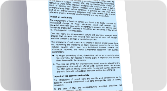 Entrepreneurship Education: A road to success The main impacts of institutional changes through prioritising entrepreneurship education Impact on students Students in educational institutions prioritising entrepreneurship were found to have higher entrepreneurial skills than their peers in 8conventional9 schools. Attainment rates and motivation have risen, including in some cases the engagement of parents (for instance in supporting entrepreneurship projects). In the cases of Aalborg University (DK) and the Massachusetts9 Institute of Technology (MIT) (USA), improved entrepreneurial skills were found to be the result of learning and working conditions which support team work and problem-solving under real-life conditions. A guidance structure which forms part of an 8entrepreneurship ecosystem9 that helps students with all steps related to creating a venture was also found to be a very positive factor. Impact on institutions The engagement of heads of schools was found to be highly conducive for institutional change. At Misgav elementary school staff members were rewarded when they engaged in entrepreneurial projects. MIT removed legal barriers to enable staff members to found their own companies, if they wished to. This supported staff motivation. Over the years, an entrepreneurial culture and ecosystem emerged which ensures that students have support from experienced tutors and mentors available to them at all steps of the start-up process. The importance of such measures is evident as student entrepreneurs single out networking and mentoring as highly important supportive factors. This includes benefits which stem from institutional business contacts and information networks, and hence strengthened cooperation with business stakeholders: At Misgav elementary school, stakeholders took on an increasingly active role over time, for instance in helping pupils to implement the business ideas developed in the classroom. The close ties of the MIT with technology-based industries allowed for the development of several spin-offs led by MIT staff and alumni. This ensures that MIT staff are closely connected to the relevant business sectors and are up to date with technological innovation and the state-of-the-art. Impact on the economy and society The introduction of project work and real3life work environments led to students acquiring professional and core employability skills at Aalborg University. In the case of MIT, the entrepreneurship ecosystem established had measurable economic results: The total annual revenues (estimated $2 trillion) and the employment footprint (estimated 3.3 million employees) of MIT alumni-founded firms are equivalent to the 11th largest economy in the world. The impact of MIT alumni goes beyond the US: The majority of the MIT alumni firms are founded in the US, but 790 MIT alumni firms were also created in Europe (mainly in England, France and Germany in the software and consulting sectors). MIT alumni companies are often set in highly active and innovative sectors such as software, electronics (including instruments, semiconductors, and 46