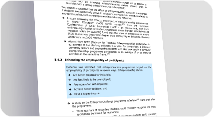 Entrepreneurship Education: A road to success both on Korean and US students, compared to control groups. The study demonstrated statistically significant differences between target and control groups in both countries. The results imply that the cultural context plays a role: American students start from a different level: they are already inclined in creating a venture, have higher self-confidence and recognise the importance of entrepreneurship education. The Korean students, although starting from lower levels of knowledge, intention etc. reached the level of US students after entrepreneurship education. Results imply that the impact of entrepreneurship courses will be greater in countries with an emerging entrepreneurship culture (Korea) than in countries with a strong entrepreneurship culture (USA). Two studies suggested that the effect of entrepreneurship education is enhanced if students are additionally active in voluntary, non-curricular activities related to entrepreneurship, such as entrepreneurship clubs and networks: A study discussing the 8Effects and impact of entrepreneurship programmes 178 in Higher Education9 (JADE career survey) from the European Confederation of Junior Enterprises (JADE 3 an international, non-profit umbrella-organisation of student enterprises across Europe; established and managed solely by students) found that the share of entrepreneurs among JADE alumni was three times higher than among Higher Education students which were not JADE members. Alumni from NFTE (Network for Teaching Entrepreneurship) participated in an average of five start-up activities in a year. For comparison, a group of university science and engineering students who also took part in a curricular entrepreneurship programme participated in an average of three start-up 179 activities in the same time frame. 5.4.2 Enhancing the employability of participants Evidence was identified that entrepreneurship programmes impact on the employability of participants in several ways. Entrepreneurship alumni Are better prepared to find a job; Are less likely to be unemployed; Are more often self-employed; Achieve better positions; and Have a higher income. 180 A study on the Enterprise Challenge programme in Ireland found that after the programme: Three quarters of secondary students could correctly recognise the most appropriate behaviour for interviews; 87% of primary students and 65% of secondary students could correctly recognise the characteristics that employers regard as important and seek in their employees; 87% of primary students and 73% of secondary students understood the purpose of a CV. 178 ibid 179 Vanessa E. Beary (2013): The NFTE Difference: Examining the Impact of Entrepreneurship Education. 180 Junior Achievement Ireland. Enterprise Challenge programme 2010/2011. National Evaluation Report 69